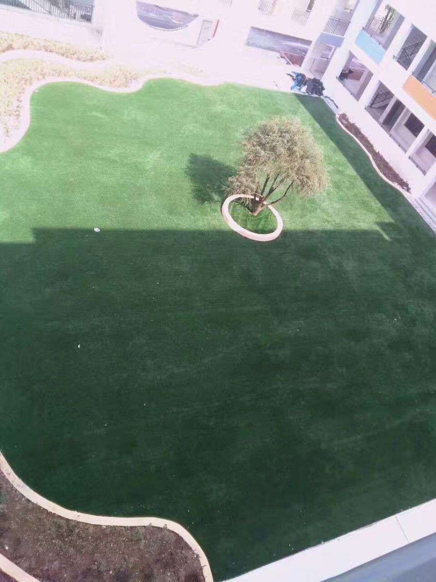 因?yàn)檫@個(gè)綠化場地是異形的需要定制,所以選擇鋪裝人造草坪也會(huì)相對(duì)比較簡單,人造草坪具備的其中一個(gè)優(yōu)點(diǎn)就是可以根據(jù)場地定制設(shè)計(jì)然后鋪裝出來,效果也是很好的,可以看下面的施工完成圖。