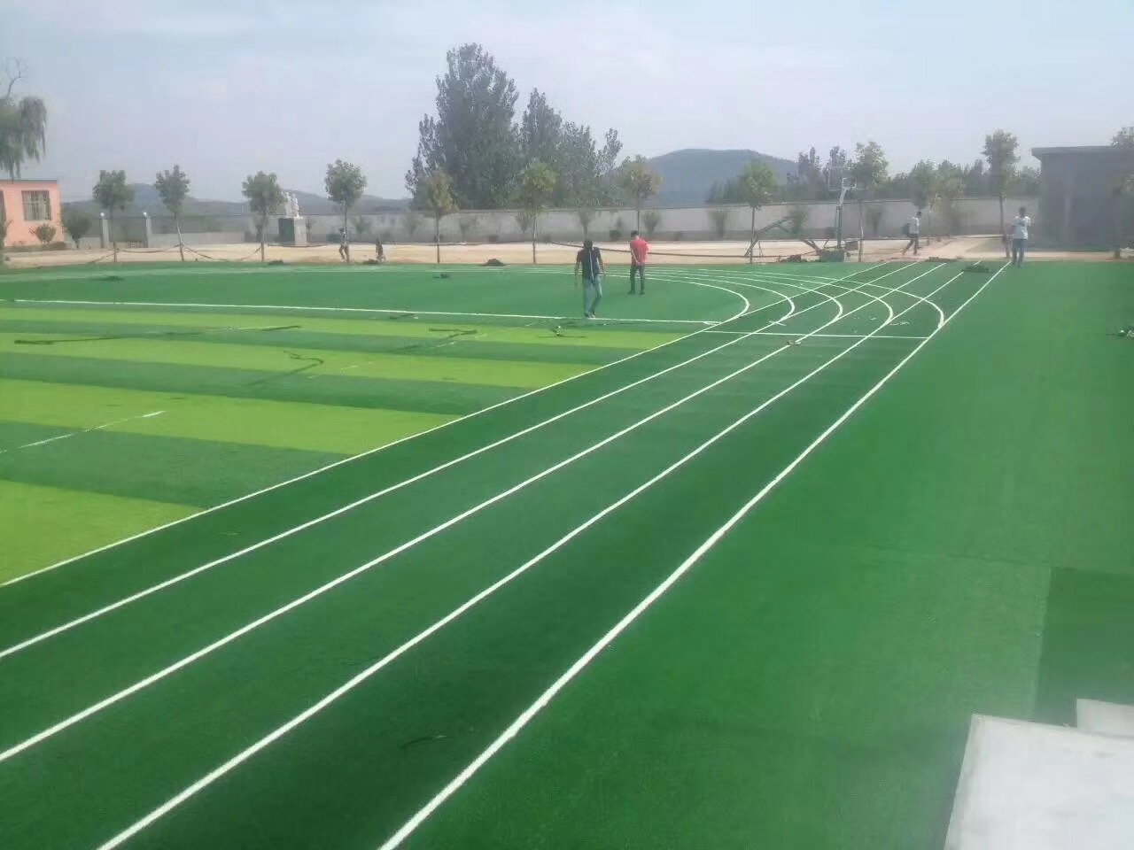 人造草坪項(xiàng)目面積:2700平方足球場(chǎng)跑道,在使用人造草坪鋪裝足球場(chǎng)的同時(shí),選用了休閑草來(lái)鋪裝跑道,工期快一步到位。
